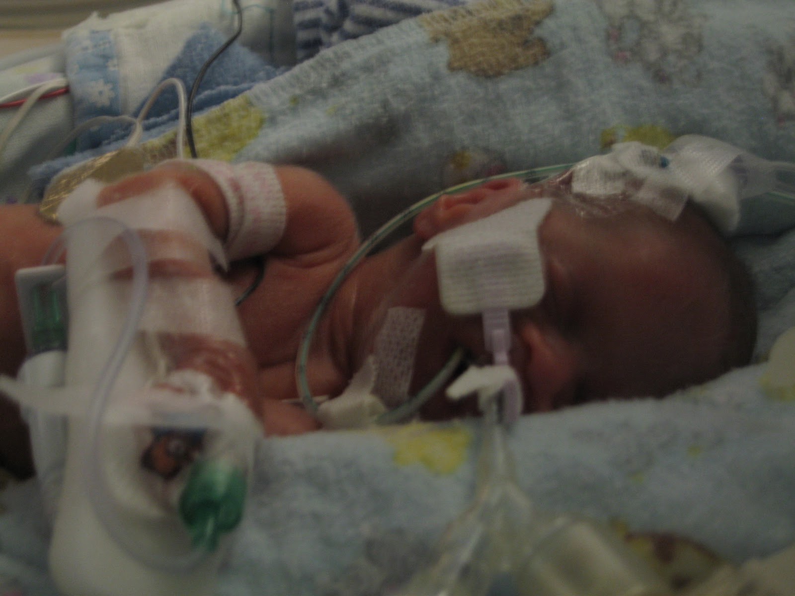 Survival rates for babies this small is about 80%. Baby Tiernan's vital signs are good. He has good color. He is breathing on his own. The tube in his mouth is an air vent that goes down to his little tummy so it doesn't fill with air. He started out with a breathing tube, but on the very first day that was taken out and replaced with a tiny little c-pap machine. He is just like his daddy!
